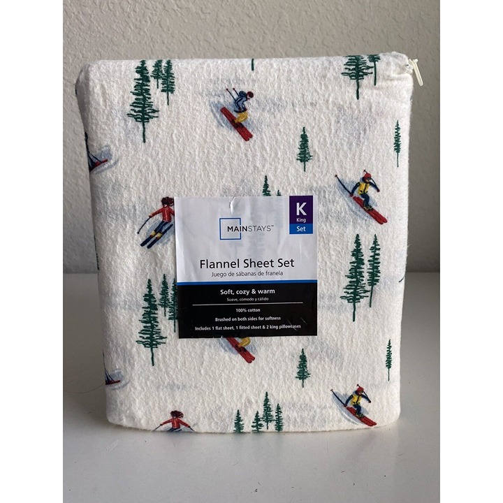 Mainstays SKIERS Trees Flannel Sheet Set King Size 100% Cotton 4 Piece NEW